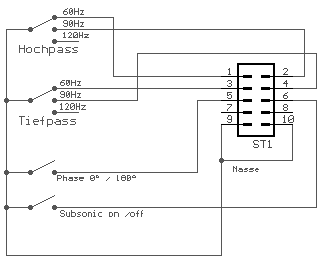 Hier wird ein Umschalter für den Linkwitz-Tiefpass und für die Satellitenhochpässe verwendet.