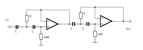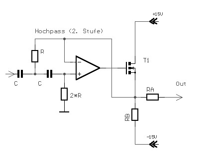 Dieser sieht genau so aus wie das schon beschriebene Subsonicfilter, mit dem Unterschied, dass hier eine Flankensteilheit von 24dB/Okt. erreicht werden sollte. Somit kommen zwei hintereinander geschaltete 12-dB Hochpässe zum Einsatz: