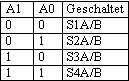 Verwendet werden nur 3 Schaltstufen - S1A bzw. S1B bleiben frei. Da die Eingänge A0 und A1 über die 4.7k Widerstände auf logisch eins liegen, benötigt man lediglich noch eine Umschaltung, die in der ersten Stufe A1 auf null schaltet (60 Hz), in der zweiten Stufe A0 auf null schaltet (90 Hz) und in der dritten Stufe nichts schaltet (= beide auf logisch 1 =>120 Hz).