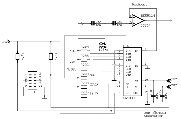 Dem Gesamtschaltbild ist zu entnehmen, dass noch einige weitere Schaltungserweiterungen vorgenommen wurden. So wurde der mechanische Grenzfrequenzumschalter des ersten Layouts durch elektronische (IC1, IC6, IC12, IC13, IC16 , IC17) ersetzt. Zum einen weil ich kein Freund mechanischer Umschalter bin - früher oder später machen sie "schlapp" (weil quasi keine Ströme geschaltet werden).
